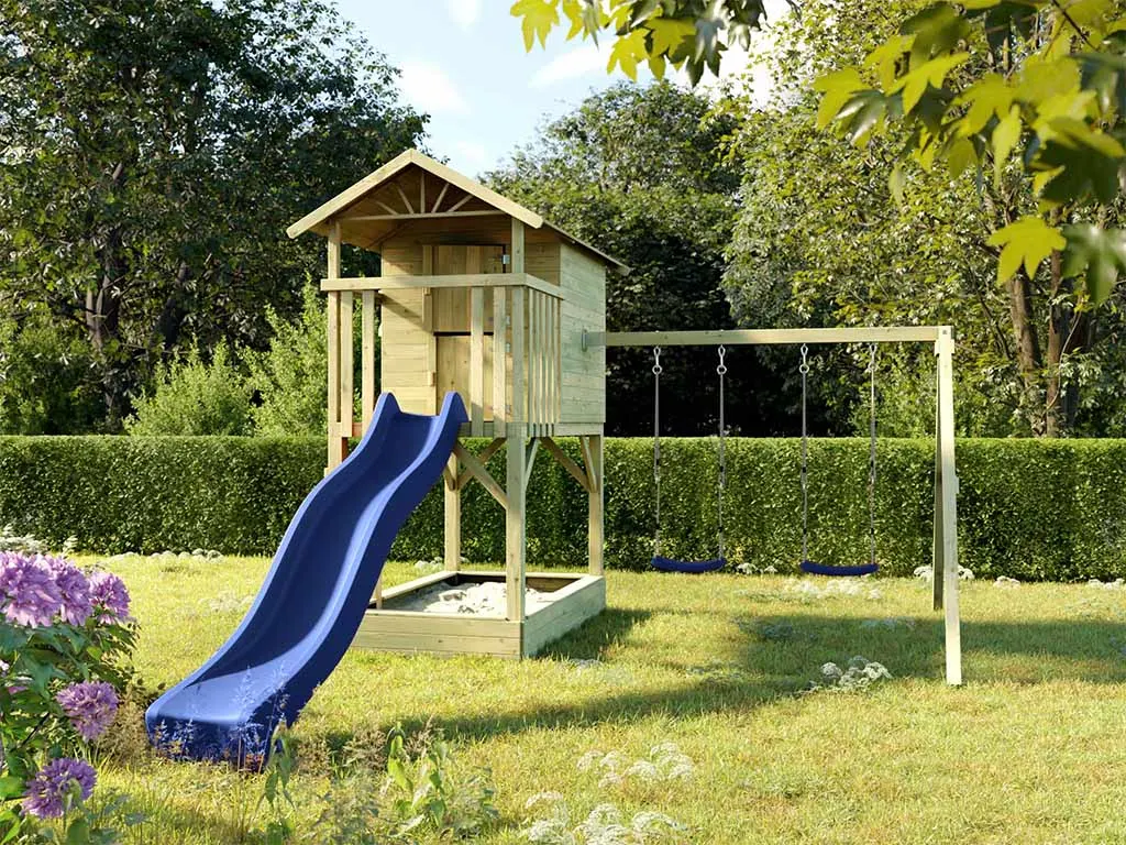 Stelzenhaus Tree Hut, Sandkasten, Doppelschaukel, Rutsche blau