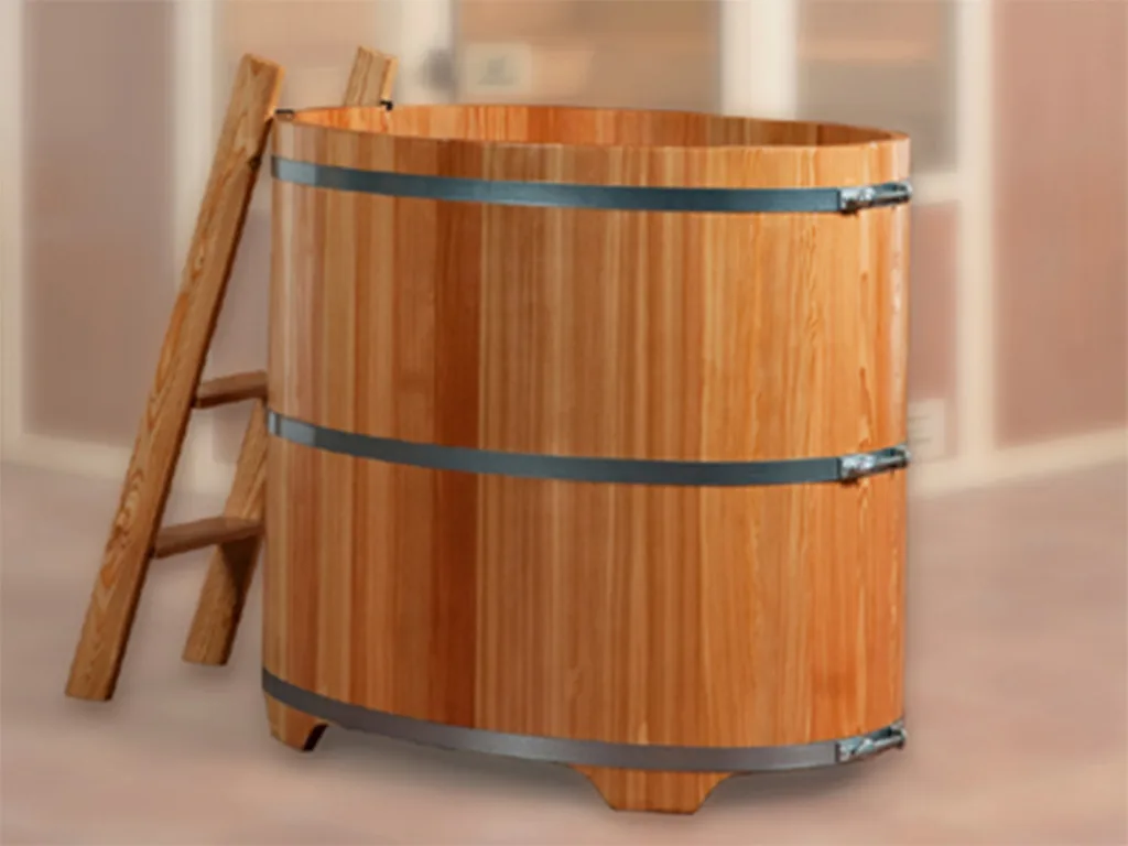 Der ovale Tauchbottich von WEKA ist aus sauber gehobeltem, naturbelassenem Lärchenholz mit drei verzinkten, nachspannbaren Bandstahlstreifen. Der Tauchbottich ist mit einem Ablaufventil, einer Innentrittstufe, einem Standrohr als Überlaufsicherung und einer Einstiegsleiter ausgestattet. Die einzelnen Nut- und Federbretter sind wasserfest verleimt und innen wasserdicht beschichtet. Der Tauchbottich ist nur für die Nutzung im Innenbereich vorgesehen, da die Spezialbeschichtung nicht UV-beständig ist.