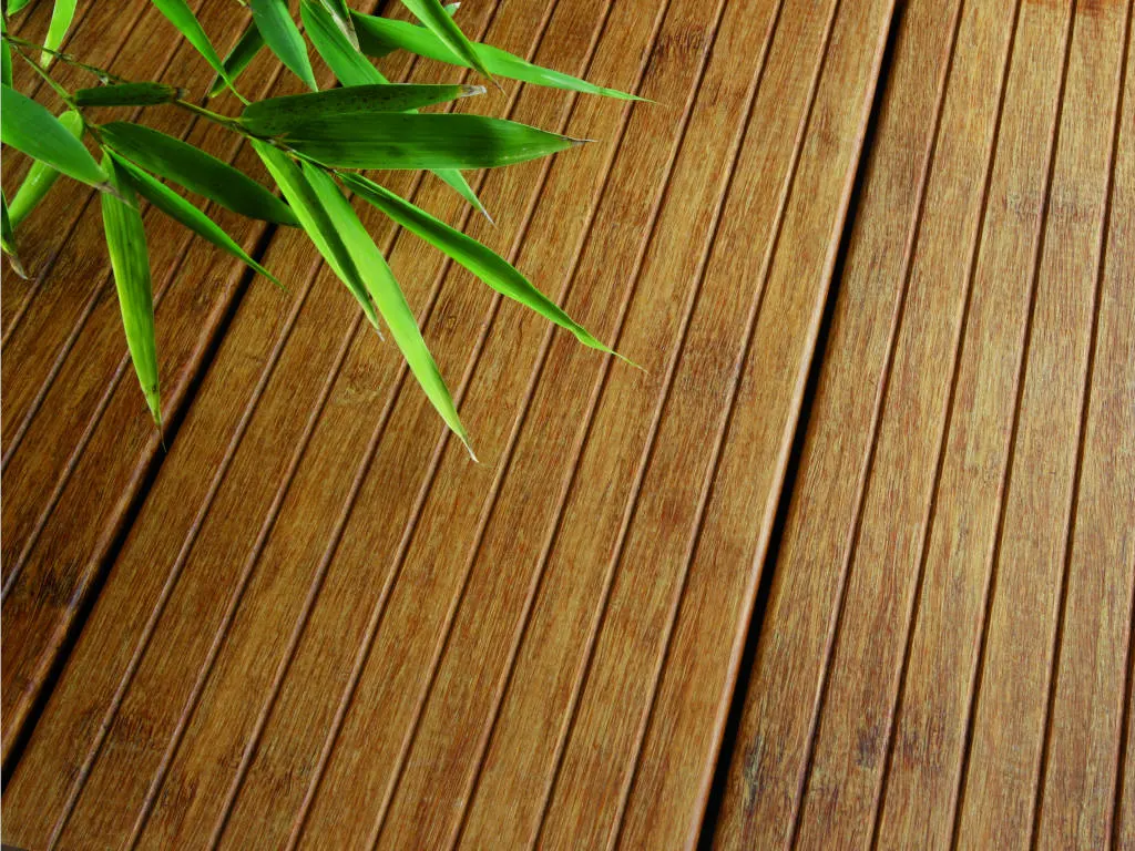 Diese 18 mm starken Terrassendielen werden aus massivem Bambus-Holz hergestellt.