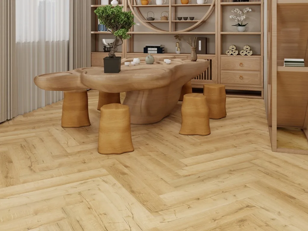 Das Dekor mit typischer Eichenholzmaserung charakterisiert perfekt den Stil der rustikalen Moderne. Das Fischgrätdesign wirkt luxuriös und schafft eine außergewöhnliche Atmosphäre. Dieser fugenlose Bodenbelag erzielt aufgrund seiner nahtlos aneinander gereihten Dielen ein ebenmäßiges und harmonisches Gesamtbild. Dank modernster Herstellungsverfahren werden Musterwiederholungen in der Oberflächenstruktur weitestgehend vermieden, sodass ein natürlich authentischer Holzlook entsteht.