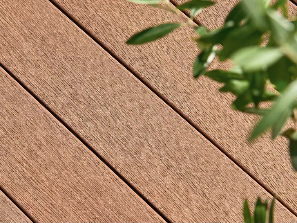 Diese 21 mm starke Terrassendielen werden aus WPC hergestellt.