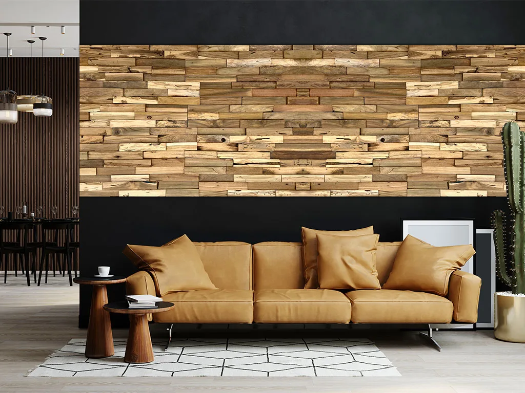 Die Montage der Holz-Paneele gestaltet sich spielend leicht – sie können einfach mit einem starken elastischen Polymerkleber an die Wand geklebt werden. Für den besonders authentischen Look ist ein Verlegen im wilden Verband die erste Wahl. Um die zufällig wirkende Anordnung zu erzielen, müssen die Paneele in den aufeinanderfolgenden Reihen ungleich positioniert werden. So entsteht ein dekoratives gemischtes Muster.