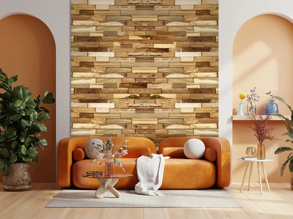 Die Montage der Holz-Paneele gestaltet sich spielend leicht – sie können einfach mit einem starken elastischen Polymerkleber an die Wand geklebt werden. Für den besonders authentischen Look ist ein Verlegen im wilden Verband die erste Wahl. Um die zufällig wirkende Anordnung zu erzielen, müssen die Paneele in den aufeinanderfolgenden Reihen ungleich positioniert werden. So entsteht ein dekoratives gemischtes Muster.