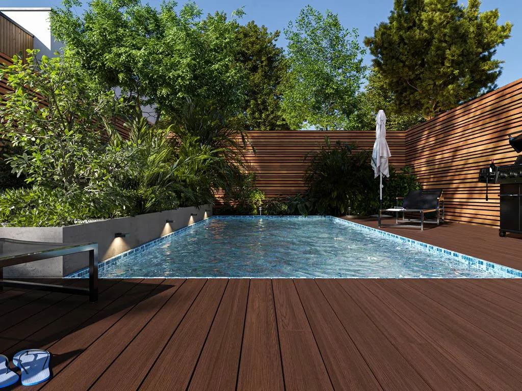 WPC (Wood Plastic Composite) ist eine Verbindung aus ca. 50 % Holz und 50 % Kunststoff. Dieser Verbundwerkstoff ist besonders pflegeleicht und bedarf aufgrund des hohen Kunststoffanteils keiner regelmäßigen Nachbehandlung. Das geringe Quell- und Schwindverhalten zeichnet WPC als einen besonders form- und farbstabilen Werkstoff aus, der nicht zu Rissbildungen und Splittern neigt. Das macht WPC-Dielen zum idealen Terrassenbelag und dank ihrer Rutschfestigkeit auch zur optimalen Poolumrandung. Die hohe Dichte von WPC entspricht der von tropischen Harthölzern. WPC-Dielen sind resistent gegen Pilz- und Insektenbefall, sowie Feuchtigkeit und Witterung.