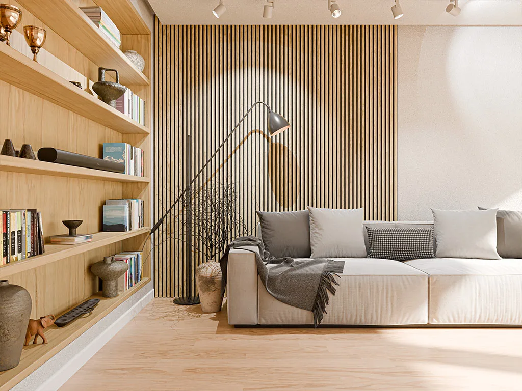 Akustikpaneele dienen der Gestaltung von Wänden und Decken. Zusätzlich stehen die akustischen Eigenschaften der Produkte im Vordergrund. Die Paneele haben eine schwarze Trägerplatte aus recyceltem, schallabsorbierenden Polyester, auf denen Lamellen (MDF) angebracht sind, die mit astfreier Eiche furniert sind.