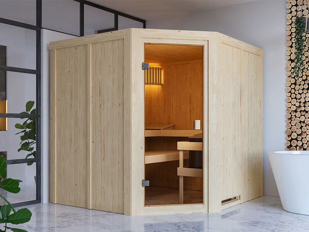 Dieses Saunamodell eine System- bzw. Elementsauna zeichnet sich durch seine besondere Sandwich-Bauweise aus, d.h. die Wandelemente bestehen aus einzelnen Schichten. Die bereits vorgefertigten Wandelemente ermöglichen einen schnellen Aufbau innerhalb weniger Stunden.