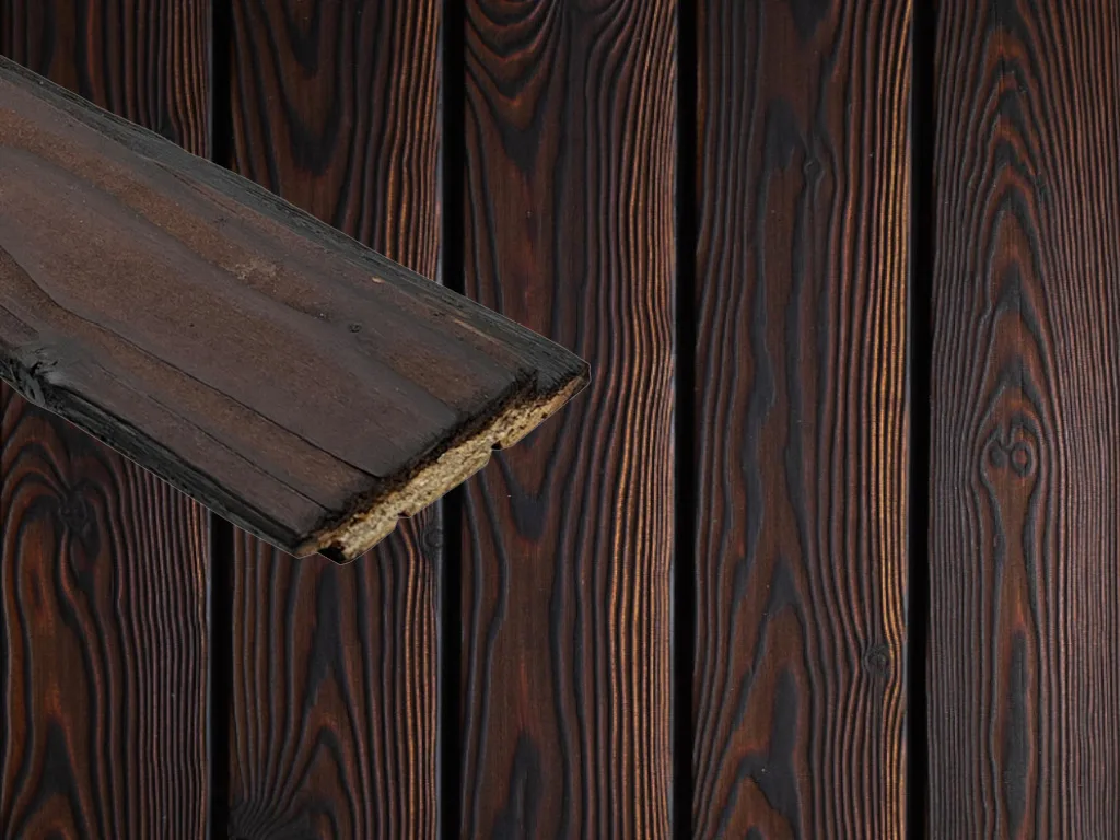 Bitte beachten: Da die Fassadenhölzer mit Feuer behandelt wurden, können sich Rußrückstände auf der Oberfläche befinden, die bei Berührung auf Kleidung und Hände abfärben können.