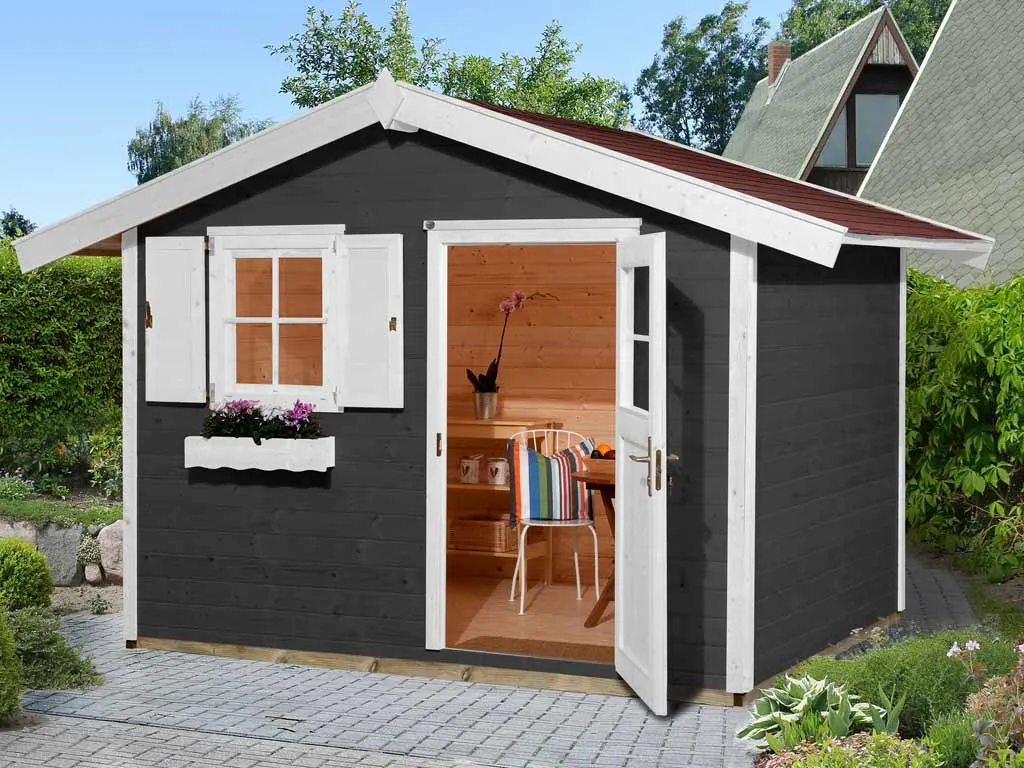 Setze ein farbiges Highlight in Deinem Garten. Dieses Gartenhaus überzeugt nicht nur durch seine Optik, der Holzschutzlack/-lasur in Anthrazit schützt obendrein vor Schädlingen und Witterungseinflüssen und macht das Holz langlebiger und robuster. So ist auch nach längerer Zeit kein weiteres Streichen nötig.