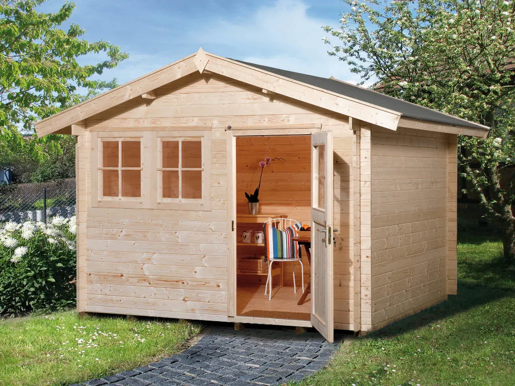 Als der Klassiker unter den Gartenhäusern verfügt ein Blockbohlenhaus über eine sehr robuste Bauweise, gepaart mit einer besonderen, natürlichen Ästhetik. Dabei orientiert sich die Bohlenbauweise an der traditionellen Blockhütte. Die Wände setzen sich aus vorgefertigten Holzbohlen zusammen, die dank einer Nut- und Feder-Verbindung ohne größere Anstrengungen aufeinander gesteckt werden können. Damit ist ein einfacher und schneller Auf- und Abbau garantiert. An der Kopfseite des Gartenhauses sorgt die charakteristische Verkämmung (spezielle Einkerbungen im Holz) nicht nur für eine schöne Optik, sondern hält das ganze Konstrukt auch zusammen und macht es absolut wind- und wetterfest.