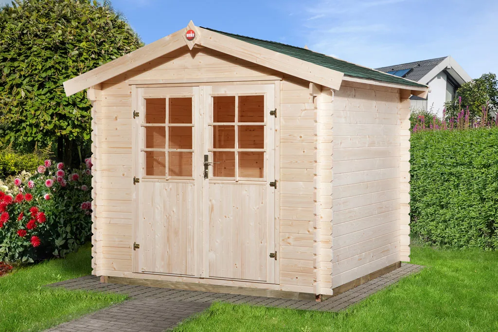 Als der Klassiker unter den Gartenhäusern verfügt ein Blockbohlenhaus über eine sehr robuste Bauweise, gepaart mit einer besonderen, natürlichen Ästhetik. Dabei orientiert sich die Bohlenbauweise an der traditionellen Blockhütte. Die Wände setzen sich aus vorgefertigten Holzbohlen zusammen, die dank einer Nut- und Feder-Verbindung ohne größere Anstrengungen aufeinander gesteckt werden können. Damit ist ein einfacher und schneller Auf- und Abbau garantiert. An der Kopfseite des Gartenhauses sorgt die charakteristische Verkämmung (spezielle Einkerbungen im Holz) nicht nur für eine schöne Optik, sondern hält das ganze Konstrukt auch zusammen und macht es absolut wind- und wetterfest.