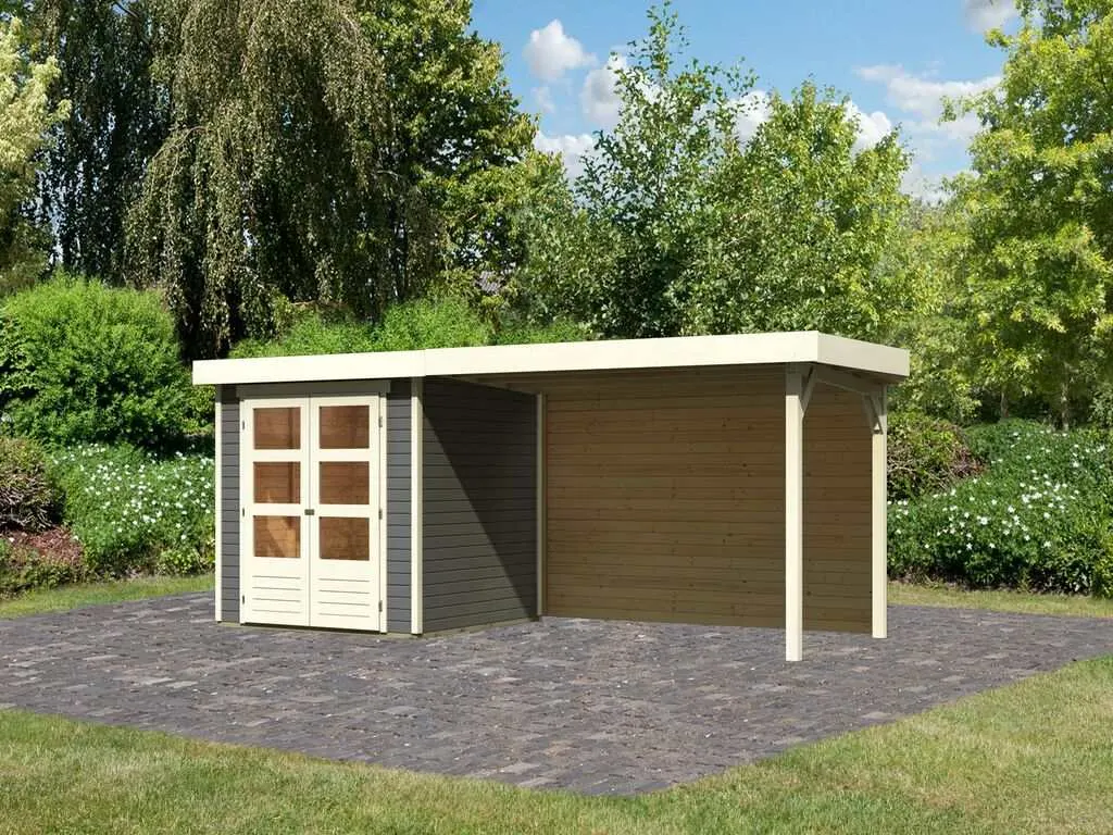 Das Gartenhaus mit Anbaudach und Rückwand ist sehr vielseitig. Der durch das Anbaudach geschaffene zusätzliche Stauraum eignet sich optimal als Lagerplatz für Gartenutensilien oder als Sitzbereich zum gemütlichen Verweilen. Dank Überdachung und integrierter Rückwand sind Geräte und Gartenmöbel optimal vor Wind und Wetter geschützt.