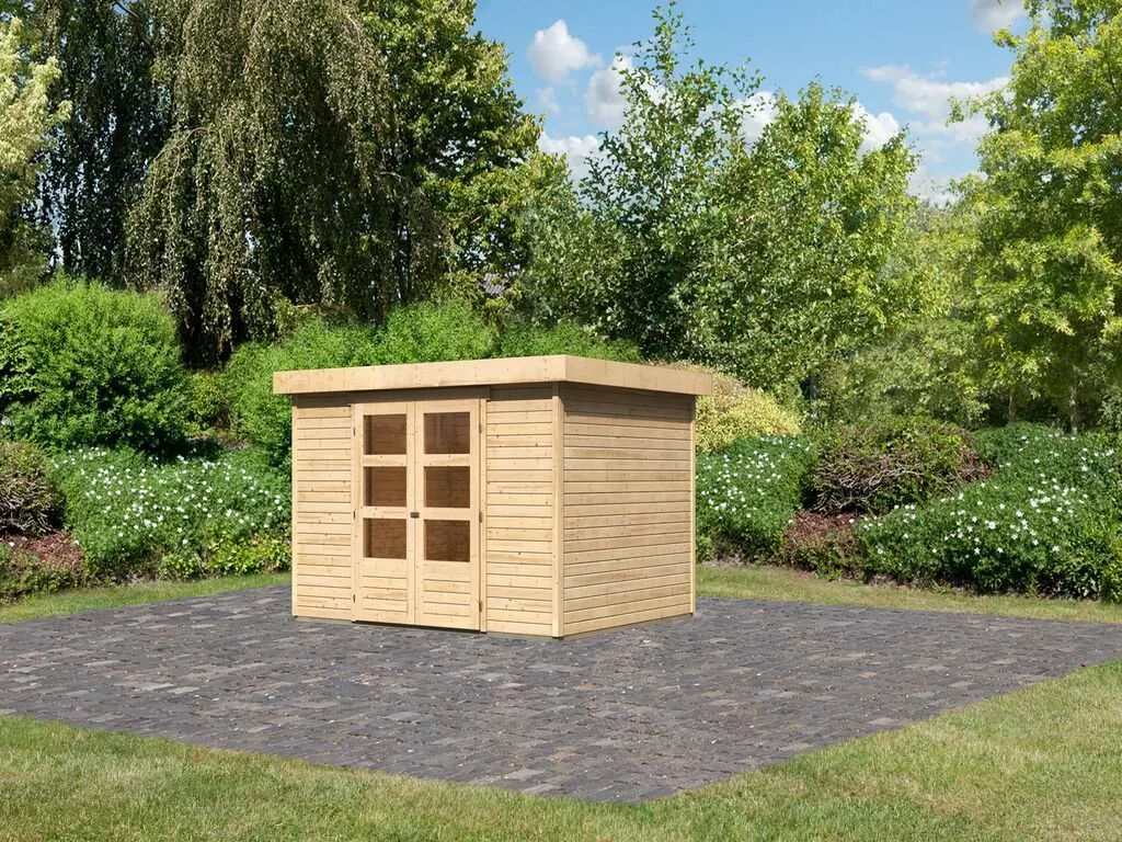Die Grundfläche des Gartenhauses beträgt 7,21 m² mit einem Sockelmaß von 298 x 242 cm (B x T). Eine optimale Raumnutzung wird dank einer Firsthöhe von 211 cm gewährt.