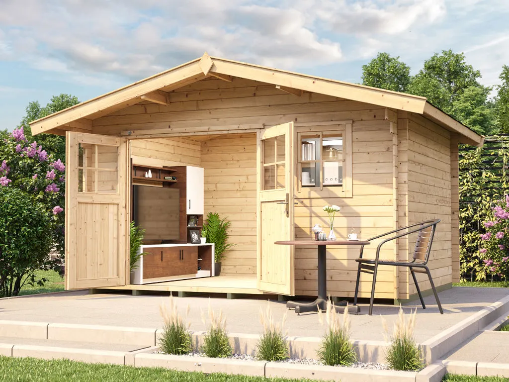 Als der Klassiker unter den Gartenhäusern verfügt ein Blockbohlenhaus über eine sehr robuste Bauweise, gepaart mit einer besonderen, natürlichen Ästhetik. Dabei orientiert sich die Bohlenbauweise an der traditionellen Blockhütte. Die Wände setzen sich aus vorgefertigten Holzbohlen zusammen, die dank einer Nut- und Feder-Verbindung ohne größere Anstrengungen aufeinander gesteckt werden können. Damit ist ein einfacher und schneller Auf- und Abbau garantiert. An der Kopfseite des Gartenhauses sorgt die charakteristische Verkämmung (spezielle Einkerbungen im Holz) nicht nur für eine schöne Optik, sondern hält das ganze Konstrukt auch zusammen und macht es absolut wind- und wetterfest.