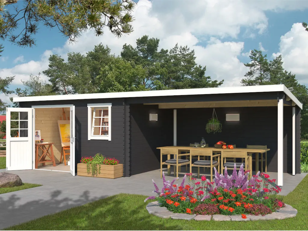 Das Gartenhaus mit Anbaudach und Rückwand ist sehr vielseitig. Der durch das Anbaudach geschaffene zusätzliche Stauraum eignet sich optimal als Lagerplatz für Gartenutensilien oder als Sitzbereich zum gemütlichen Verweilen. Dank Überdachung und integrierter Rückwand sind Geräte und Gartenmöbel optimal vor Wind und Wetter geschützt.