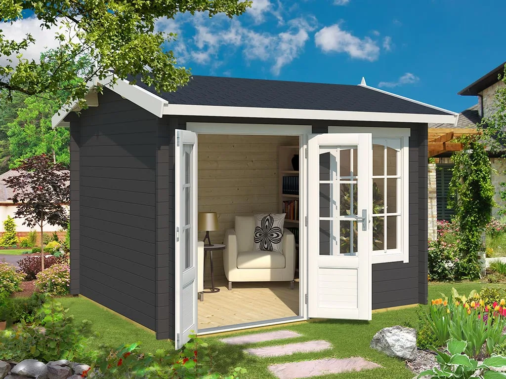 Die Wandstärke von 44 mm sorgt für gute Stabilität und Langlebigkeit. Dank der Bohlenstärke ist das Gartenhaus im Winter frostsicher, und im Sommer hat es gute wärmeisolierende Eigenschaften, was es zu einem perfekten Übernachtungsort für Gäste macht. Auch Pflanzen können in diesem Gartenhaus problemlos überwintern.