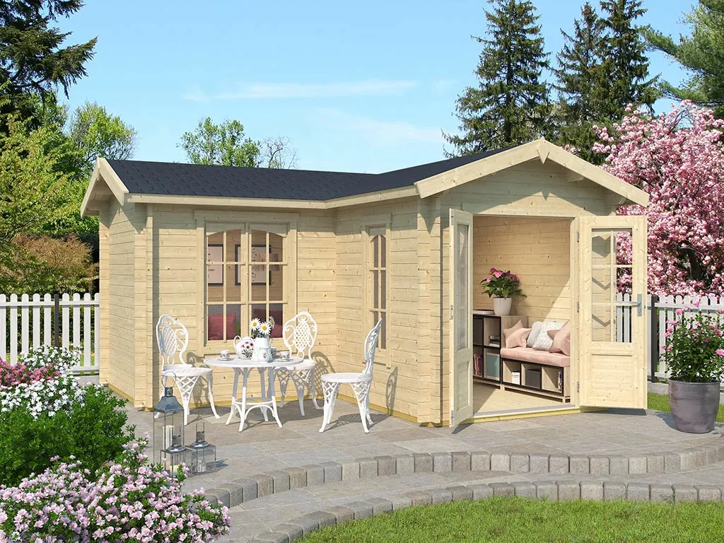 Die Wandstärke von 44 mm sorgt für gute Stabilität und Langlebigkeit. Dank der Bohlenstärke ist das Gartenhaus im Winter frostsicher, und im Sommer hat es gute wärmeisolierende Eigenschaften, was es zu einem perfekten Übernachtungsort für Gäste macht. Auch Pflanzen können in diesem Gartenhaus problemlos überwintern.
