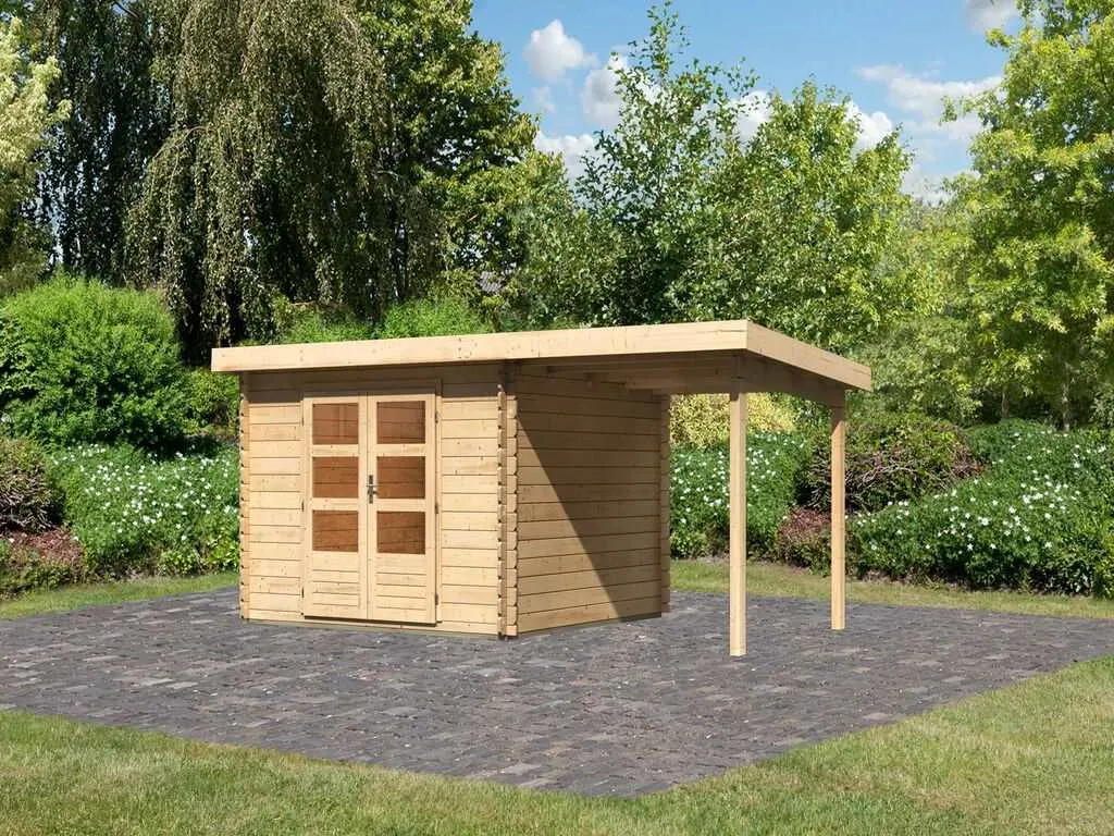 Für mehr Raum und vielfältige Nutzungsmöglichkeiten sorgt dieses Gartenhaus mit Anbaudach. Das großzügig geschnittene Anbaudach ermöglicht es, den Gartenalltag in vollen Zügen im Freien genießen zu können – geschützt vor Sonne, Wind und Regen. Der Platz unter dem Dach kann als gemütliche Terrasse zum Sitzen, Spielen oder Werkeln bei jedem Wetter genutzt werden. Alternativ eignet es sich auch als optimaler Unterstellplatz für zahlreiche Gartengeräte.