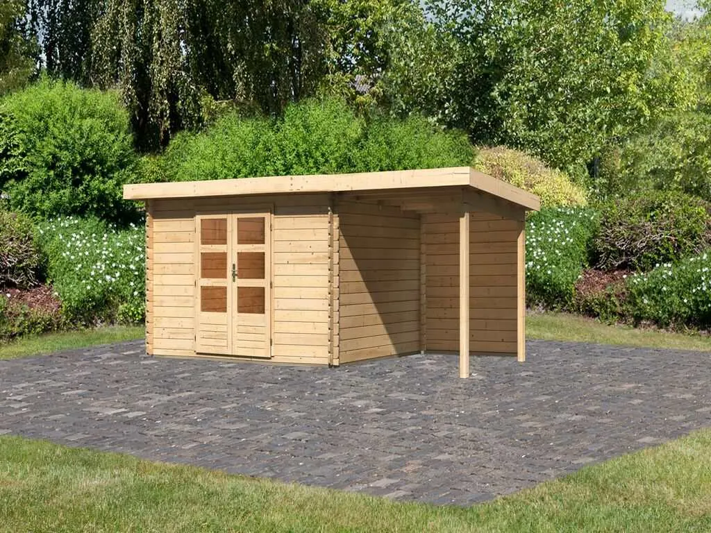 Das Gartenhaus mit Anbaudach und Rückwand ist sehr vielseitig. Der durch das Anbaudach geschaffene zusätzliche Stauraum eignet sich optimal als Lagerplatz für Gartenutensilien oder als Sitzbereich zum gemütlichen Verweilen. Dank Überdachung und integrierter Rückwand sind Geräte und Gartenmöbel optimal vor Wind und Wetter geschützt.