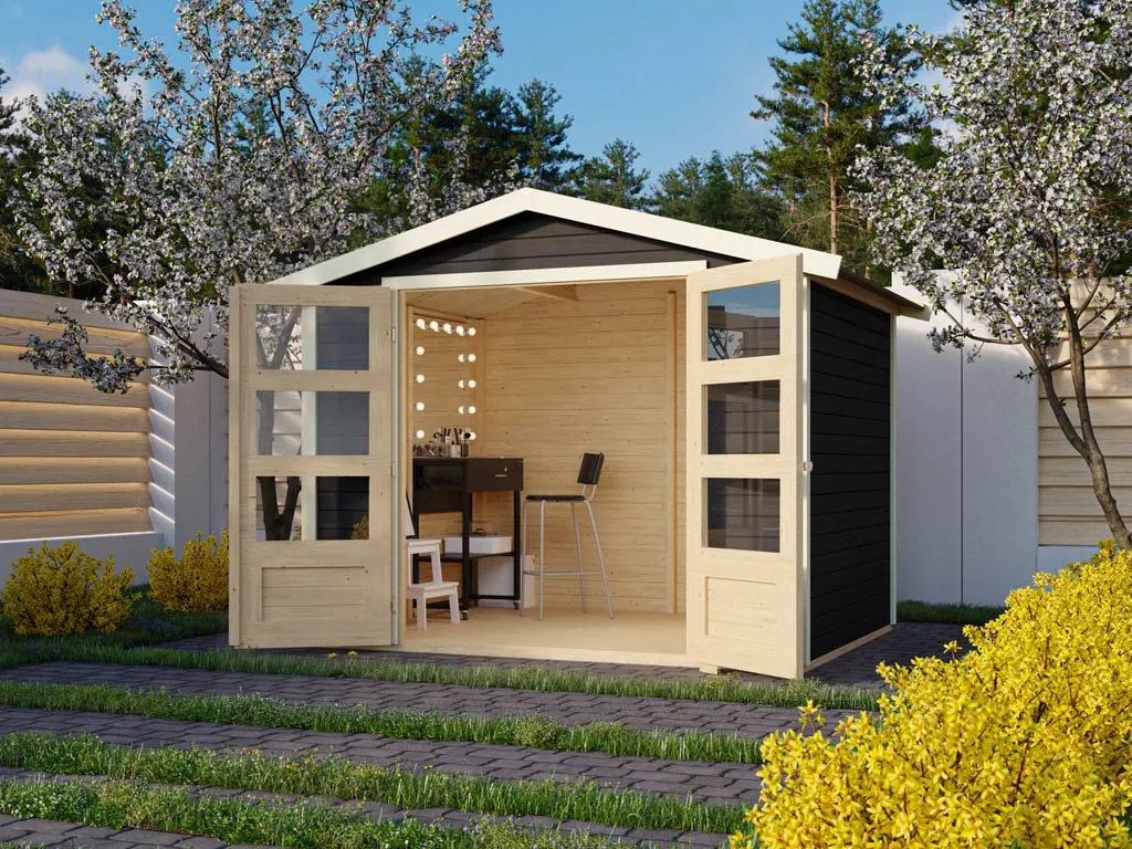 Der Sockelmaß vom Gartenhaus beträgt 302 x 242 cm (B x T). Eine optimale Raumnutzung wird dank einer Firsthöhe von 217 cm gewährt.