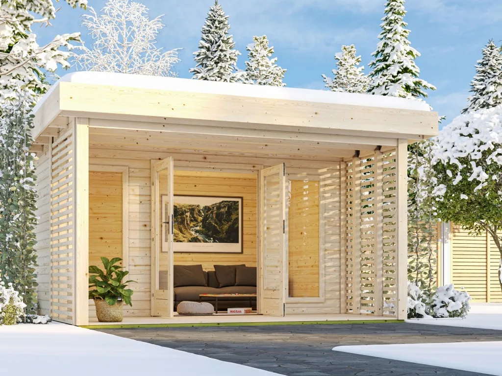 Mit einer Wandstärke von 38 mm ist das robuste Gartenhaus der perfekte Aufenthaltsort im Sommer. Aufgrund wärmedämmender Eigenschaften des hochwertigen Holzes ist es im Inneren des Gartenhauses während der prallen Sommerhitze 3–5 Grad kühler und in den kälteren Abendstunden 3–5 Grad wärmer als draußen. So hast du im heißen Sommer immer ein schattiges Plätzchen. Dank der soliden Wandstärke verwittert das Holz nicht so schnell und bleibt langlebig sowie stabil.
