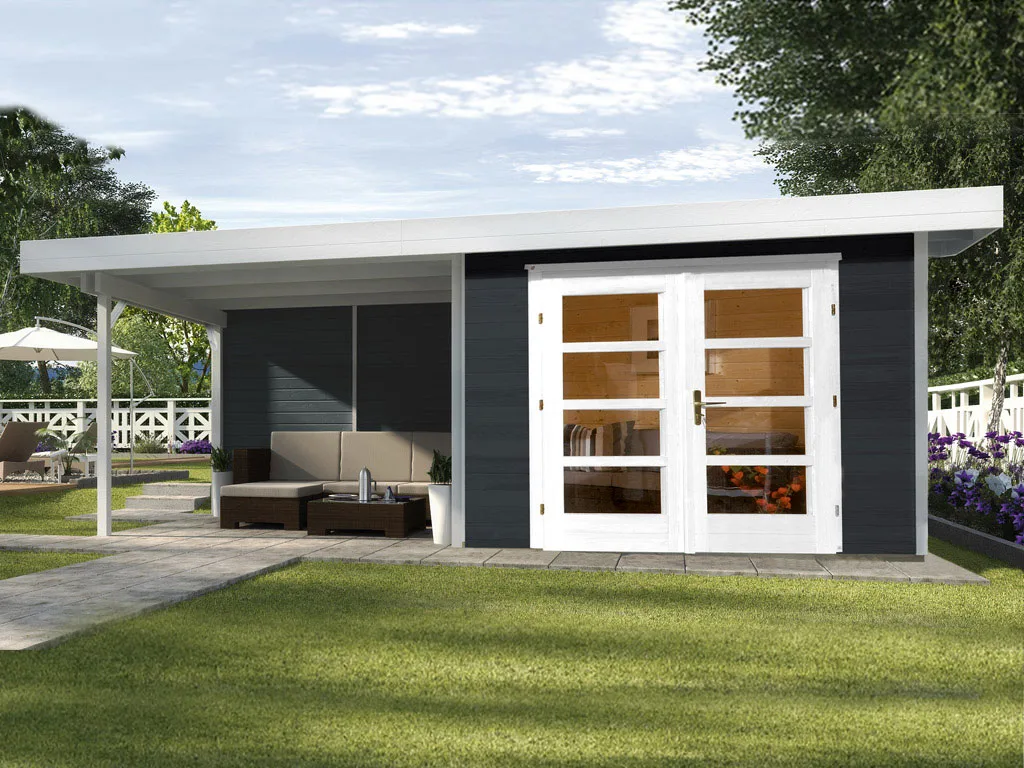 Für mehr Raum und vielfältige Nutzungsmöglichkeiten sorgt dieses Gartenhaus mit Anbaudach. Das großzügig geschnittene Anbaudach ermöglicht es, den Gartenalltag in vollen Zügen im Freien genießen zu können – geschützt vor Sonne, Wind und Regen. Der Platz unter dem Dach kann als gemütliche Terrasse zum Sitzen, Spielen oder Werkeln bei jedem Wetter genutzt werden. Alternativ eignet es sich auch als optimaler Unterstellplatz für zahlreiche Gartengeräte.