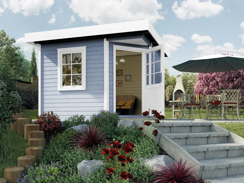Ein Gartenhaus mit Systembauweise ist eine günstige Alternative zur Blockbohlenbauweise. Auch bei dieser Bauweise werden bereits vorgefertigte Profilhölzer durch eine Nut-und-Feder-Verbindung aufeinander gesteckt. Im Gegensatz zur Blockbohlenbauweise besitzt die Systembauweise jedoch keine Einkerbungen an der Kopfseite des Gartenhauses. Die Bohlen werden stattdessen durch einen innenliegenden Holzrahmen zusammengehalten. Die Ecken werden mit hochkant angebrachten Zierleisten verdeckt. Dies macht den Auf- und Abbau besonders einfach und unkompliziert. Von Vorteil ist auch, dass Fenster und Türen nachträglich eingebaut werden können.