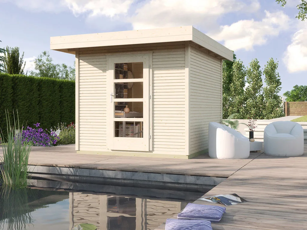 Ein Gartenhaus mit Systembauweise ist eine günstige Alternative zur Blockbohlenbauweise. Auch bei dieser Bauweise werden bereits vorgefertigte Profilhölzer durch eine Nut-und-Feder-Verbindung aufeinander gesteckt. Im Gegensatz zur Blockbohlenbauweise besitzt die Systembauweise jedoch keine Einkerbungen an der Kopfseite des Gartenhauses. Die Bohlen werden stattdessen durch einen innenliegenden Holzrahmen zusammengehalten. Die Ecken werden mit hochkant angebrachten Zierleisten verdeckt. Dies macht den Auf- und Abbau besonders einfach und unkompliziert. Von Vorteil ist auch, dass Fenster und Türen nachträglich eingebaut werden können.