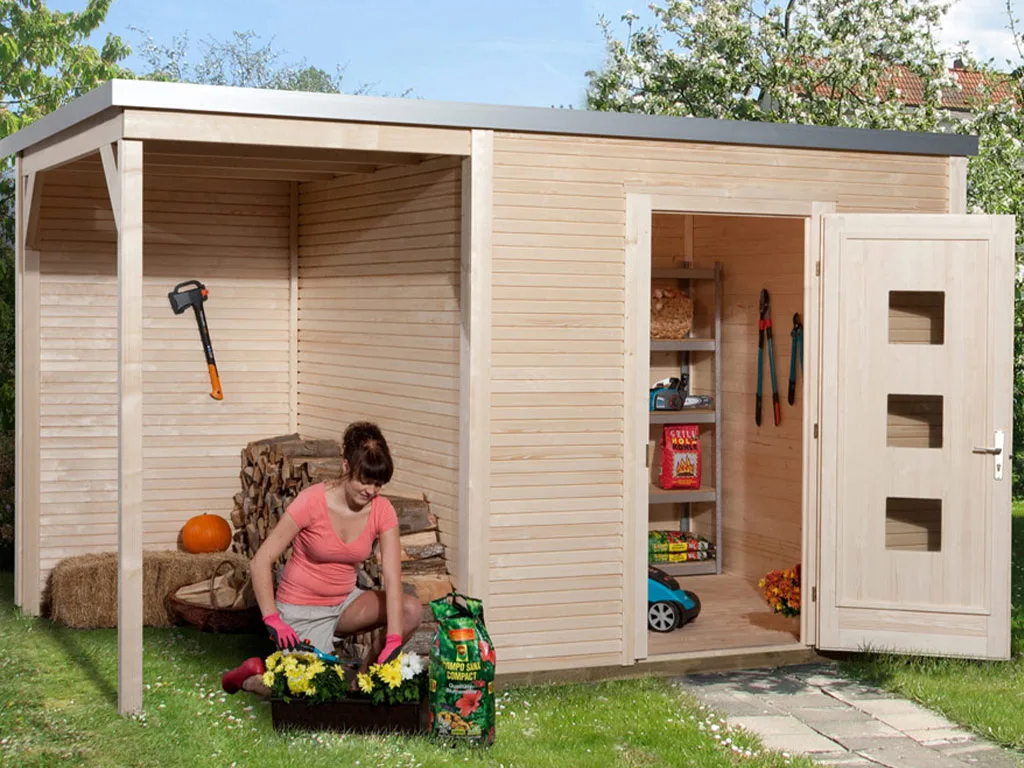 Das Gartenhaus mit Anbaudach und Rückwand ist sehr vielseitig. Der durch das Anbaudach geschaffene zusätzliche Stauraum eignet sich optimal als Lagerplatz für Gartenutensilien oder als Sitzbereich zum gemütlichen Verweilen. Dank Überdachung und integrierter Rückwand sind Geräte und Gartenmöbel optimal vor Wind und Wetter geschützt. Viel Platz für Dein Holz! Das Gartenhaus wird inklusive Kaminholzanbau mit Anbaudach geliefert. Mit der seitlichen Überdachung ist Dein Brennholz optimal vor Witterungseinflüssen geschützt und ordentlich gelagert.