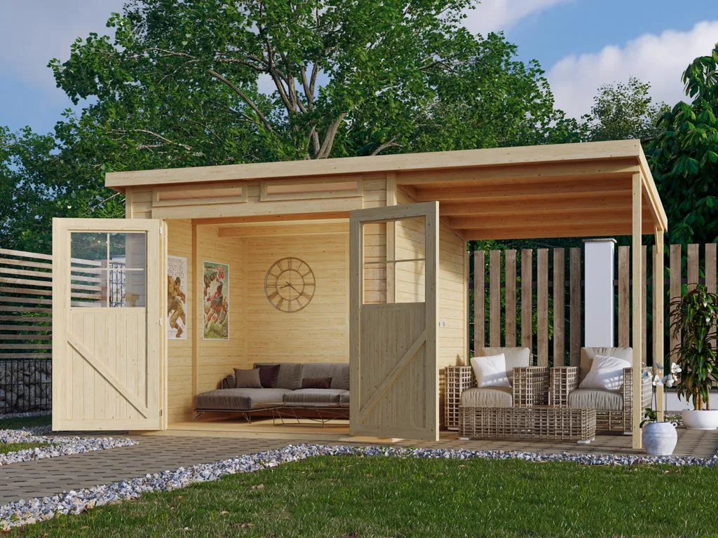 Für mehr Raum und vielfältige Nutzungsmöglichkeiten sorgt dieses Gartenhaus mit Anbaudach. Das großzügig geschnittene Anbaudach ermöglicht es, den Gartenalltag in vollen Zügen im Freien genießen zu können – geschützt vor Sonne, Wind und Regen. Der Platz unter dem Dach kann als gemütliche Terrasse zum Sitzen, Spielen oder Werkeln bei jedem Wetter genutzt werden. Alternativ eignet es sich auch als optimaler Unterstellplatz für zahlreiche Gartengeräte.