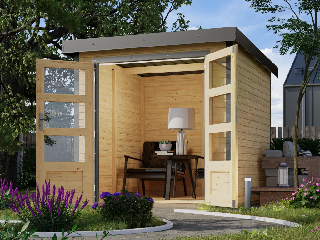 Die Grundfläche des Gartenhauses beträgt 4,45 m². Eine optimale Raumnutzung wird dank einer Firsthöhe von 208,5 cm gewährt.