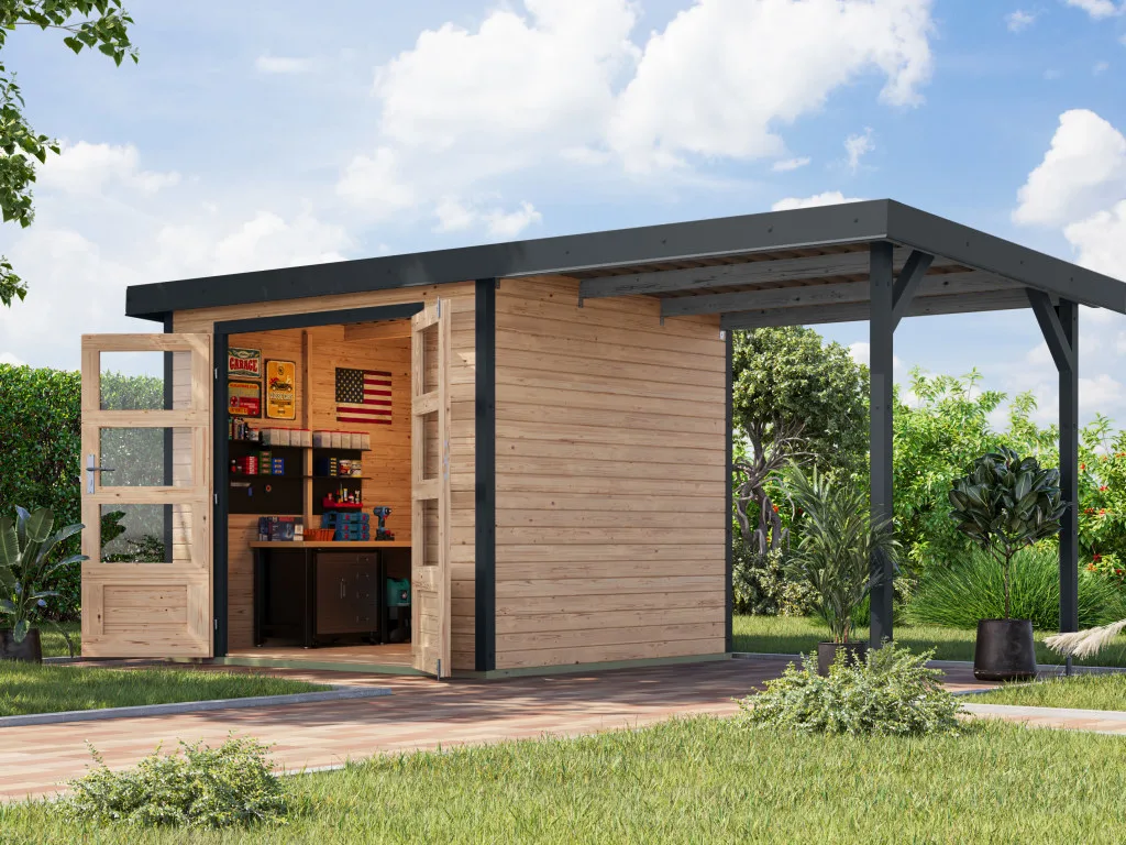 Im Vergleich zu herkömmlichen Holzgartenhäusern sind Hybridhäuser von Karibu erheblich wartungsärmer. Die Stahlecken schützen besonders gut vor Witterung und die Häuser überzeugen durch ihre moderne Optik.