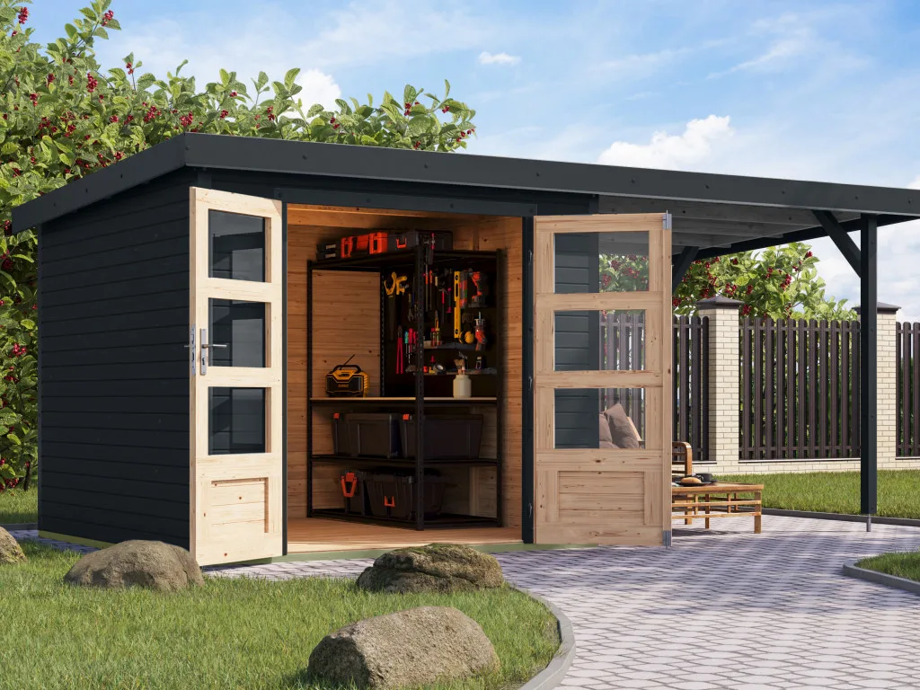Gartenhaus Jupiter 3,5 19 mm anthrazit - anthrazit mit Anbaudach 2,35 m breit