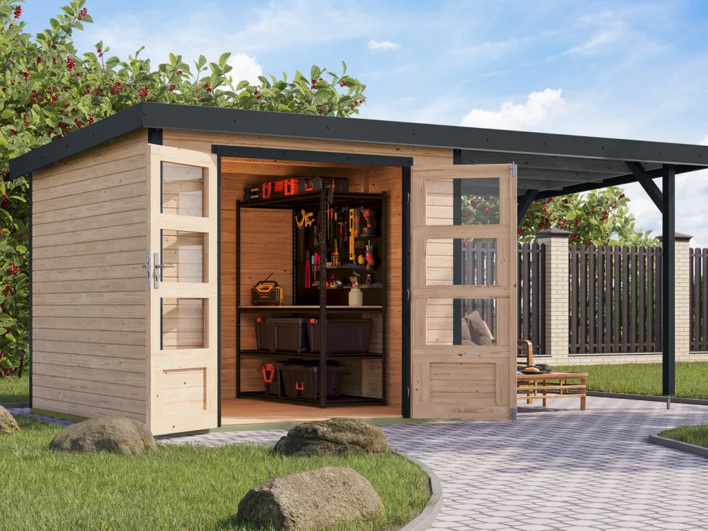 Gartenhaus Jupiter 3,5 19 mm naturbelassen - anthrazit mit Anbaudach 2,35 m breit
