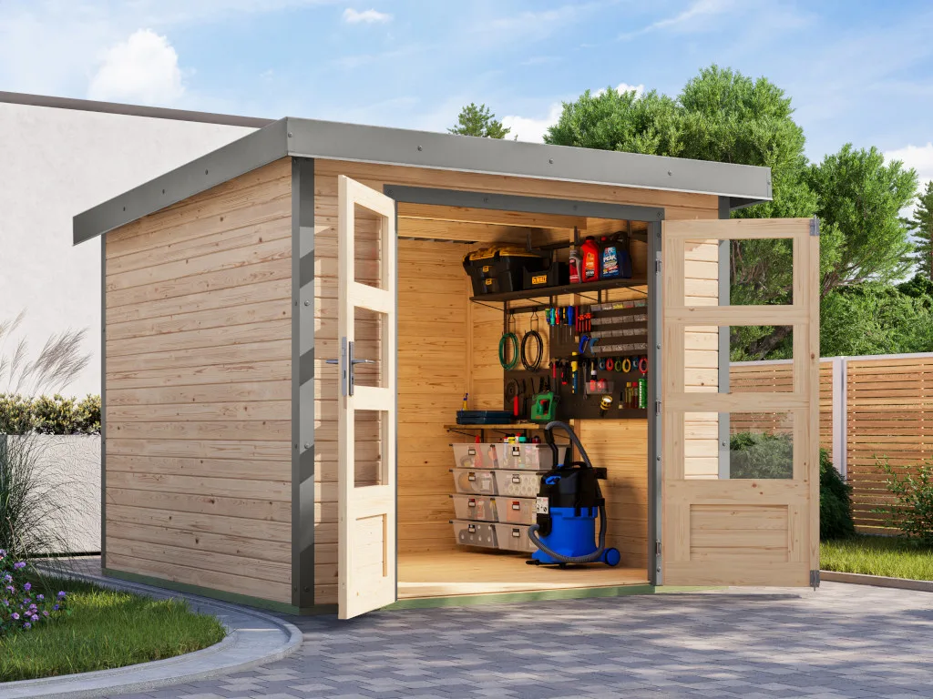 Ein modernes Pultdach verleiht deinem Gartenhaus eine stilvolle, elegante Optik. Durch nur eine geneigte Dachfläche ist die Nutzungsfläche im Inneren des Gartenhauses deutlich weniger eingeschränkt und der Verlust an Nutzraum gering. Zudem lässt die Neigungsseite des Pultdaches das Regenwasser gut abfließen und es ist die Montage von nur einer Regenrinne nötig. Des Weiteren sparst du dir Zeit und Geld bei der Montage des Daches. Durch die mitgelieferten Trapezbleche für das Dach muss kein weiteres Dachmaterial zur Eindeckung gekauft werden. Außerdem lassen sich die Platten schneller verlegen als Rauspund oder Spanplatten.