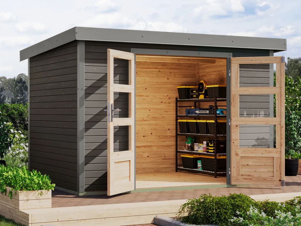 Im Vergleich zu herkömmlichen Holzgartenhäusern sind Hybridhäuser von Karibu erheblich wartungsärmer. Die Stahlecken schützen besonders gut vor Witterung und die Häuser überzeugen durch ihre moderne Optik.
