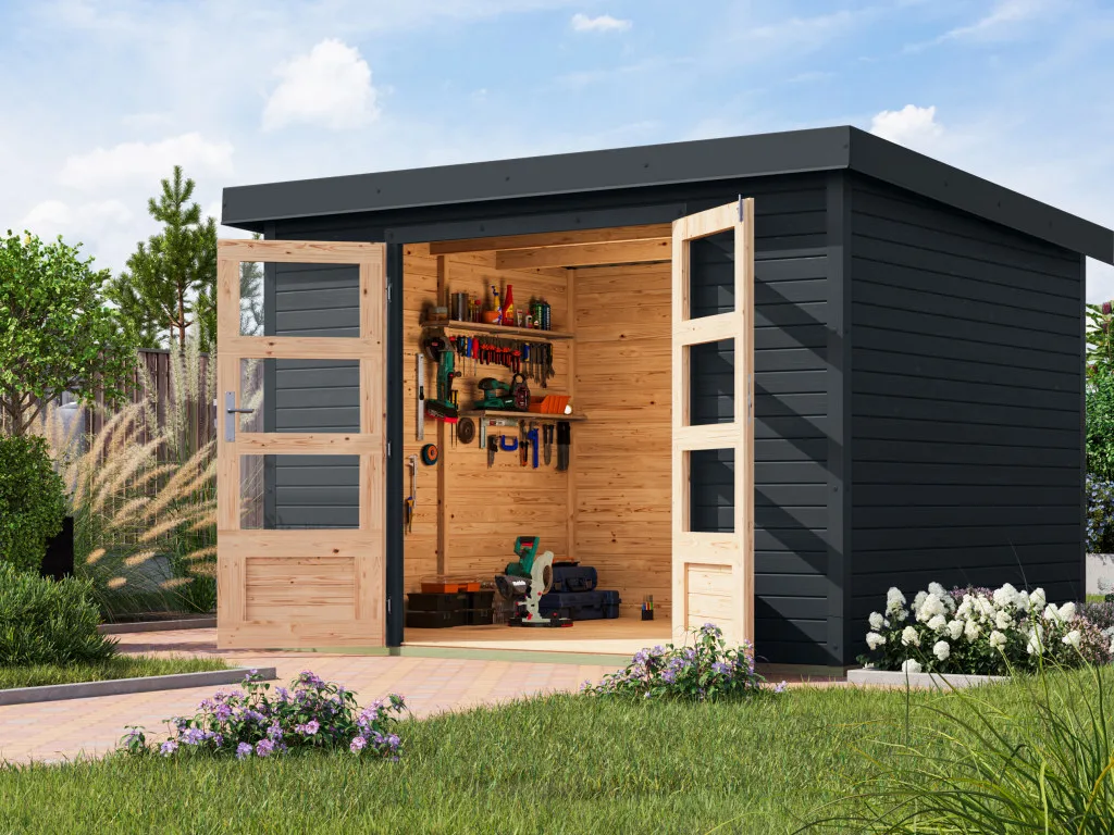 Im Vergleich zu herkömmlichen Holzgartenhäusern sind Hybridhäuser von Karibu erheblich wartungsärmer. Die Stahlecken schützen besonders gut vor Witterung und die Häuser überzeugen durch ihre moderne Optik.
