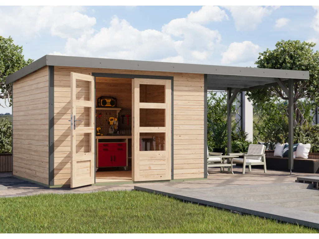 Gartenhaus Jupiter 5 19 mm naturbelassen - graualuminium mit Anbaudach 2,35 m breit
