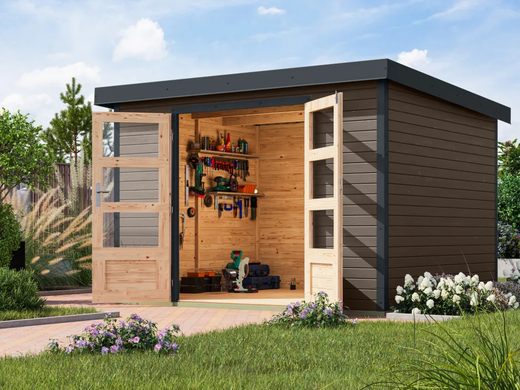 Ein modernes Pultdach verleiht deinem Gartenhaus eine stilvolle, elegante Optik. Durch nur eine geneigte Dachfläche ist die Nutzungsfläche im Inneren des Gartenhauses deutlich weniger eingeschränkt und der Verlust an Nutzraum gering. Zudem lässt die Neigungsseite des Pultdaches das Regenwasser gut abfließen und es ist die Montage von nur einer Regenrinne nötig. Des Weiteren sparst du dir Zeit und Geld bei der Montage des Daches. Durch die mitgelieferten Trapezbleche für das Dach muss kein weiteres Dachmaterial zur Eindeckung gekauft werden. Außerdem lassen sich die Platten schneller verlegen als Rauspund oder Spanplatten.