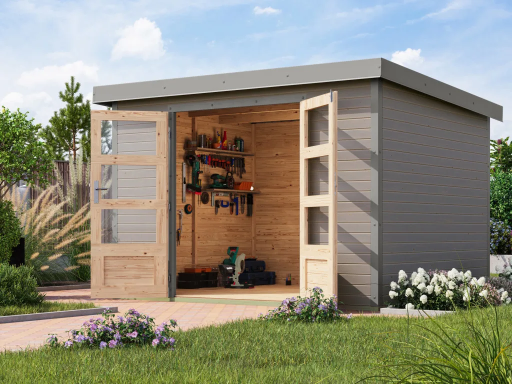 Ein modernes Pultdach verleiht deinem Gartenhaus eine stilvolle, elegante Optik. Durch nur eine geneigte Dachfläche ist die Nutzungsfläche im Inneren des Gartenhauses deutlich weniger eingeschränkt und der Verlust an Nutzraum gering. Zudem lässt die Neigungsseite des Pultdaches das Regenwasser gut abfließen und es ist die Montage von nur einer Regenrinne nötig. Des Weiteren sparst du dir Zeit und Geld bei der Montage des Daches. Durch die mitgelieferten Trapezbleche für das Dach muss kein weiteres Dachmaterial zur Eindeckung gekauft werden. Außerdem lassen sich die Platten schneller verlegen als Rauspund oder Spanplatten.