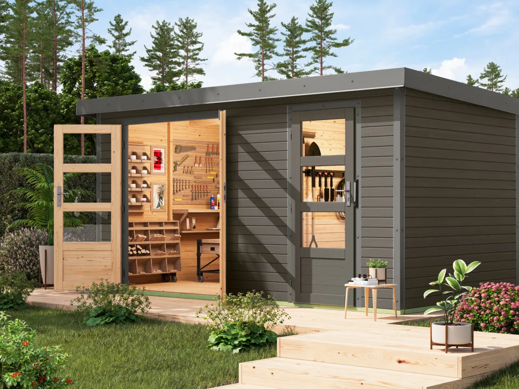 Im Vergleich zu herkömmlichen Holzgartenhäusern sind Hybridhäuser von Karibu erheblich wartungsärmer. Die Stahlecken schützen besonders gut vor Witterung und die Häuser überzeugen durch ihre moderne Optik.
