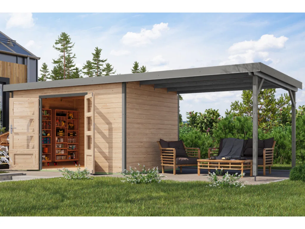Gartenhaus Pluto 7 28 mm naturbelassen - graualuminium mit Anbaudach ca. 3 m breit