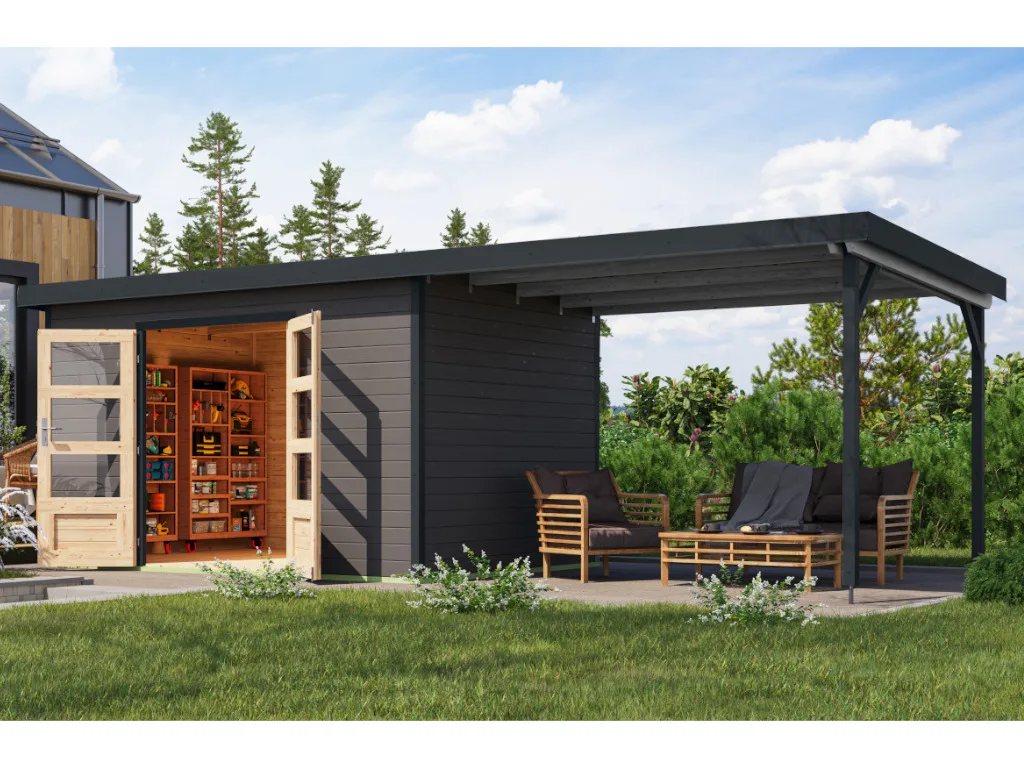 Gartenhaus Pluto 7 28 mm terragrau - anthrazit mit Anbaudach ca. 3 m breit