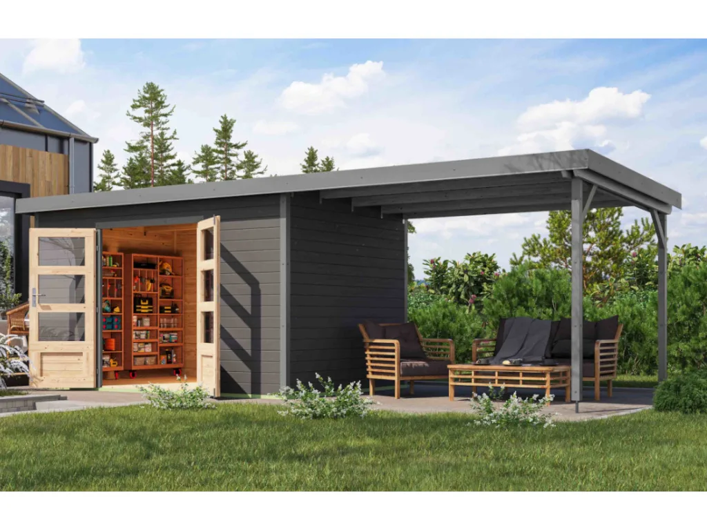 Im Vergleich zu herkömmlichen Holzgartenhäusern sind Hybridhäuser von Karibu erheblich wartungsärmer. Die Stahlecken schützen besonders gut vor Witterung und die Häuser überzeugen durch ihre moderne Optik.