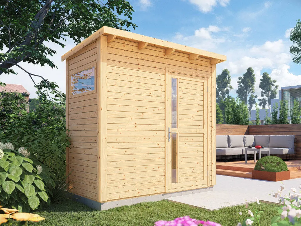 Ein modernes Pultdach aus Massivholz mit Nut- und Feder-Verbindung verleiht deinem Gartenhaus eine stilvolle, elegante Optik. Durch nur eine geneigte Dachfläche ist die Nutzungsfläche im Inneren des Gartenhauses deutlich weniger eingeschränkt und der Verlust an Nutzraum gering. Zudem lässt die Neigungsseite des Pultdaches das Regenwasser gut abfließen und es ist die Montage von nur einer Regenrinne nötig.