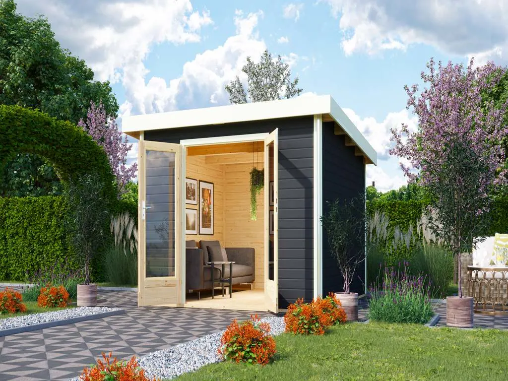 Das Gartenhaus wird aus 40 mm starken Wandbrettern aus nordischer Fichte im Steck-/Schraubsystem gefertigt und gewährleistet somit einen einfachen Aufbau und eine extrem stabile Konstruktion mit doppeltem Nut- und Federbereich der Wandbretter. Das Pultdach besteht aus Massivholzdach.
