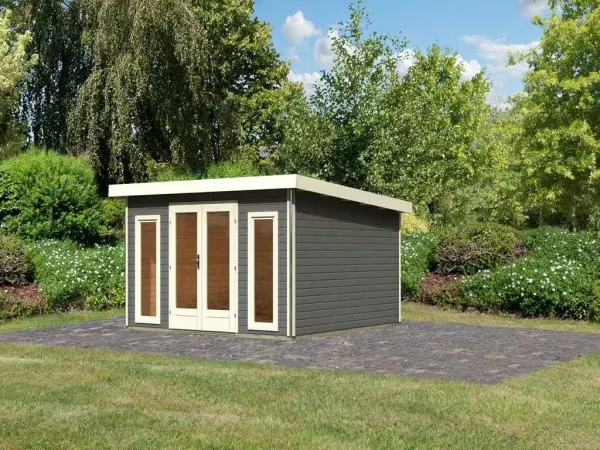 Das Gartenhaus wird aus 40 mm starken Wandbrettern aus nordischer Fichte im Steck-/Schraubsystem gefertigt und gewährleistet somit einen einfachen Aufbau und eine extrem stabile Konstruktion mit doppeltem Nut- und Federbereich der Wandbretter. Das Pultdach besteht aus Massivholzdach.