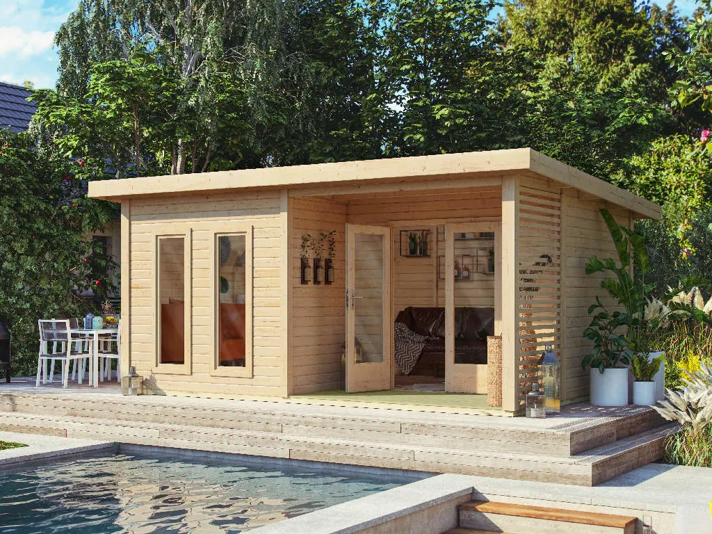 Die Grundfläche des Gartenhauses beträgt 19 m². Eine optimale Raumnutzung wird dank einer Firsthöhe von 254 cm gewährt.