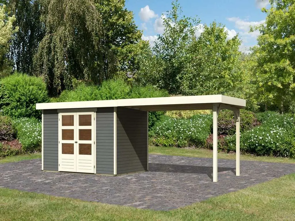 Für mehr Raum und vielfältige Nutzungsmöglichkeiten sorgt dieses Gartenhaus mit Anbaudach. Das großzügig geschnittene Anbaudach ermöglicht es, den Gartenalltag in vollen Zügen im Freien genießen zu können – geschützt vor Sonne, Wind und Regen. Der Platz unter dem Dach kann als gemütliche Terrasse zum Sitzen, Spielen oder Werkeln bei jedem Wetter genutzt werden. Alternativ eignet es sich auch als optimaler Unterstellplatz für zahlreiche Gartengeräte.