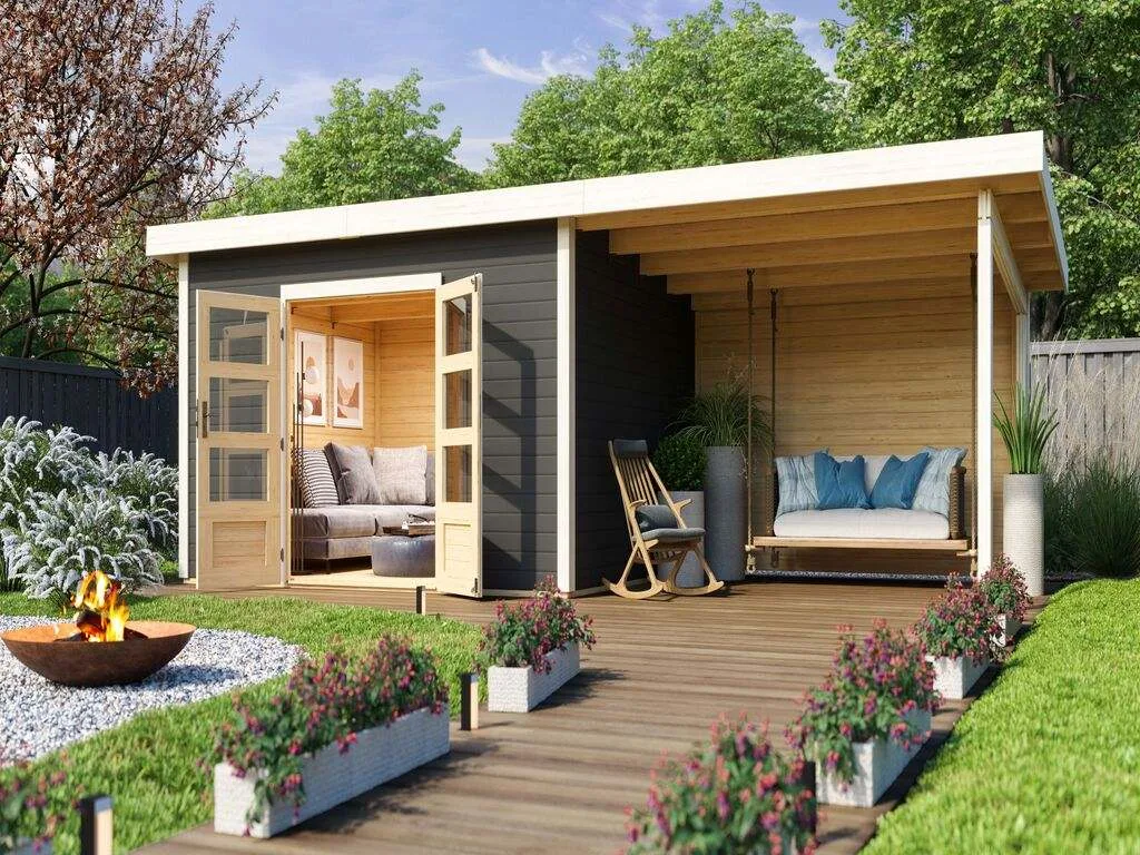 KARIBU Gartenhaus SET Northeim 4 - Terragrau, inkl. 3,3 m Anbaudach + Rückwand