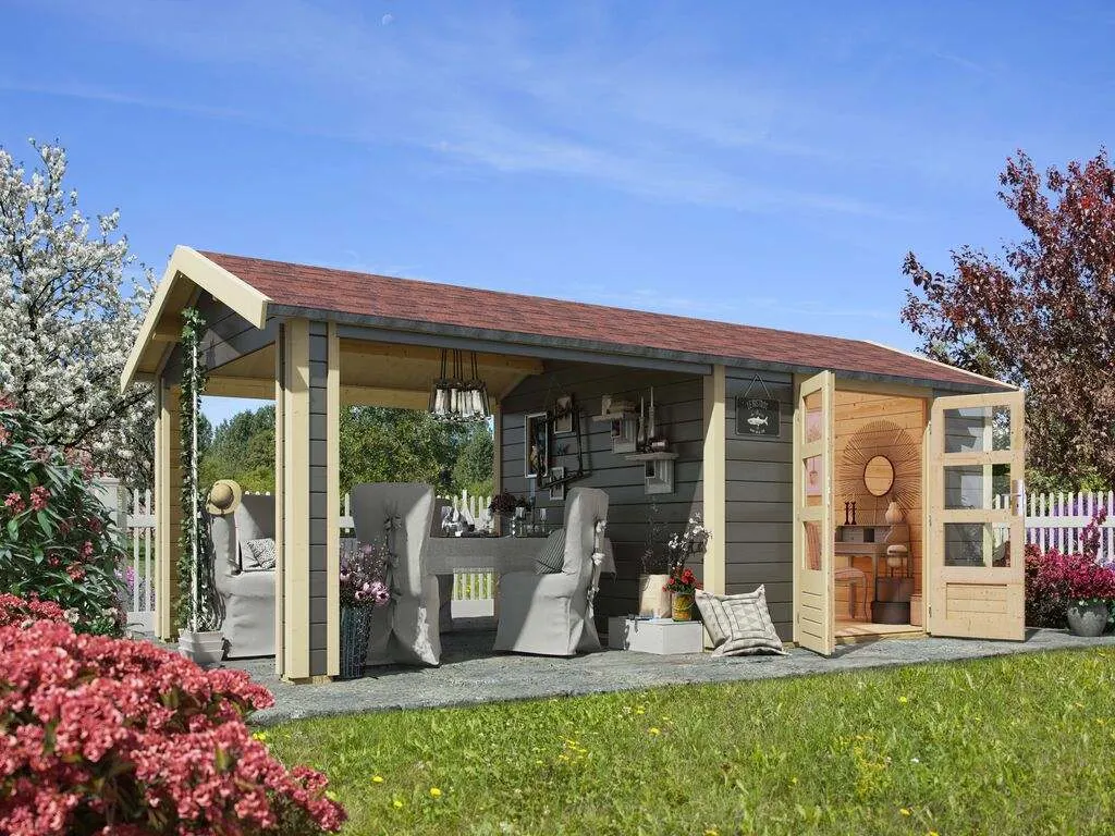 Das Gartenhaus wird aus 28 mm starken Wandbrettern aus nordischer Fichte im Steck-/Schraubsystem gefertigt und gewährleistet somit einen einfachen Aufbau und eine stabile Konstruktion. Das Satteldach besteht aus Massivholzdach.